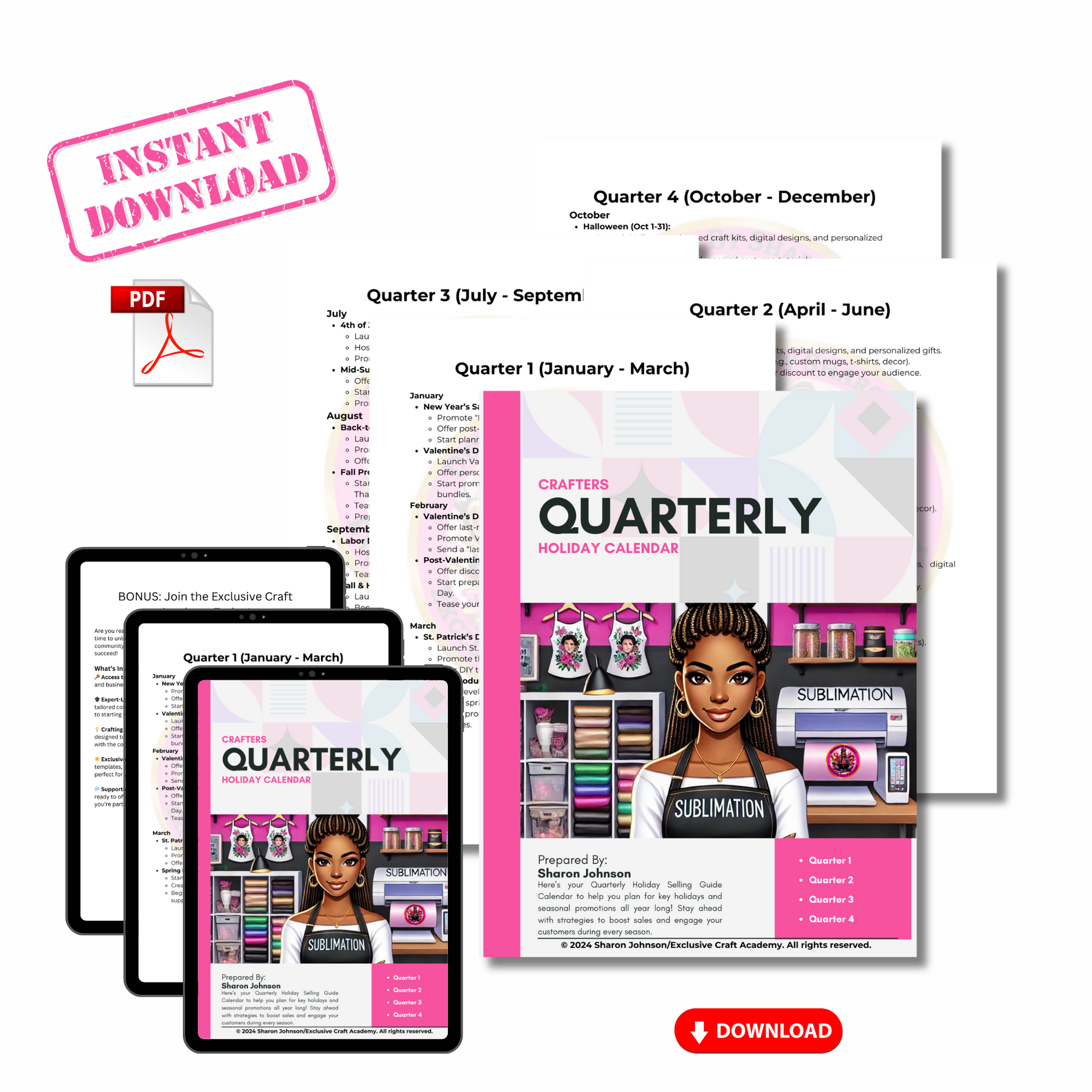 Stay ahead of the game with the Crafters Quarterly Holiday Calendar – your ultimate guide for planning and preparing crafting projects throughout the year! This downloadable PDF calendar is tailored specifically for craft enthusiasts and small business owners looking to maximize sales around key holidays and events. With a quarterly breakdown of important dates and crafting opportunities, this guide ensures that you'll never miss an important occasion to create, sell, or market your craft products.