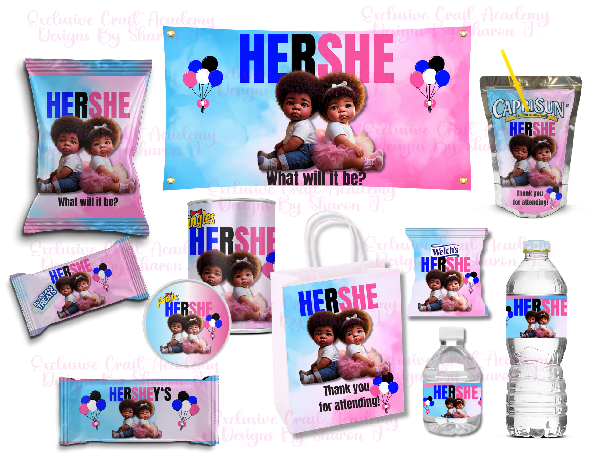 - Gender Reveal Theme: Perfect for gender reveal parties with a playful "HERSHE" theme, featuring adorable baby graphics.
