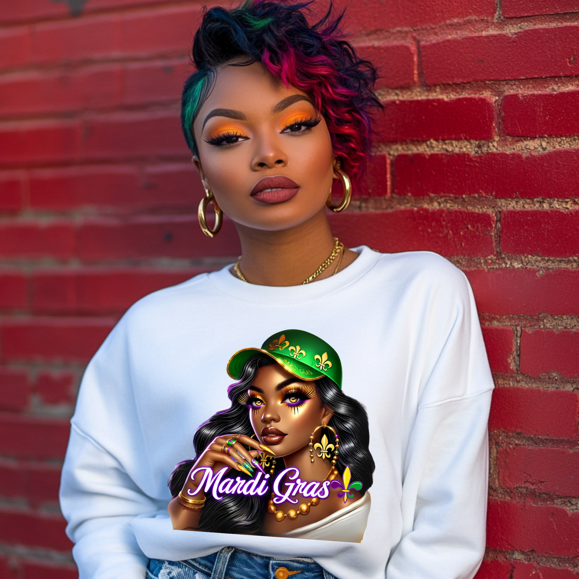 - Design Elements: Elegant Black Woman, Mardi Gras Colors, Green Fleur-de-lis Hat, Gold Accessories